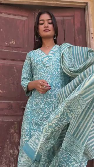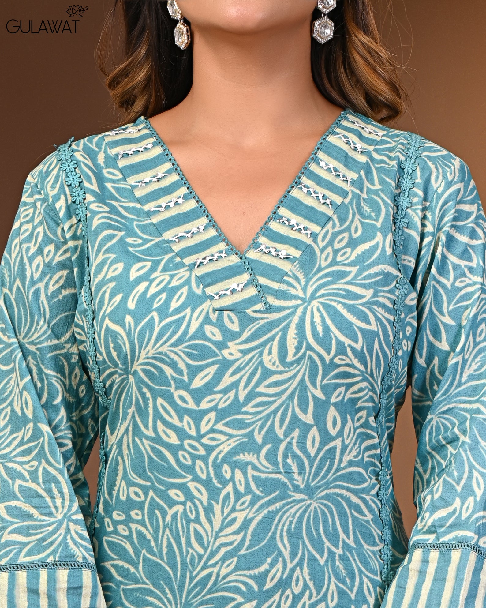 Women's Blue Digital Print With Striped Pattern Straight Cotton Kurta Pant with Dupatta 3 Piece suit by Gulawat