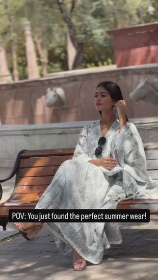 Premium White & Black Digital Print Pure Cambric Cotton 60/60 Katha Work Kurti with Pant Dupatta 3-Set ||by Gulawat