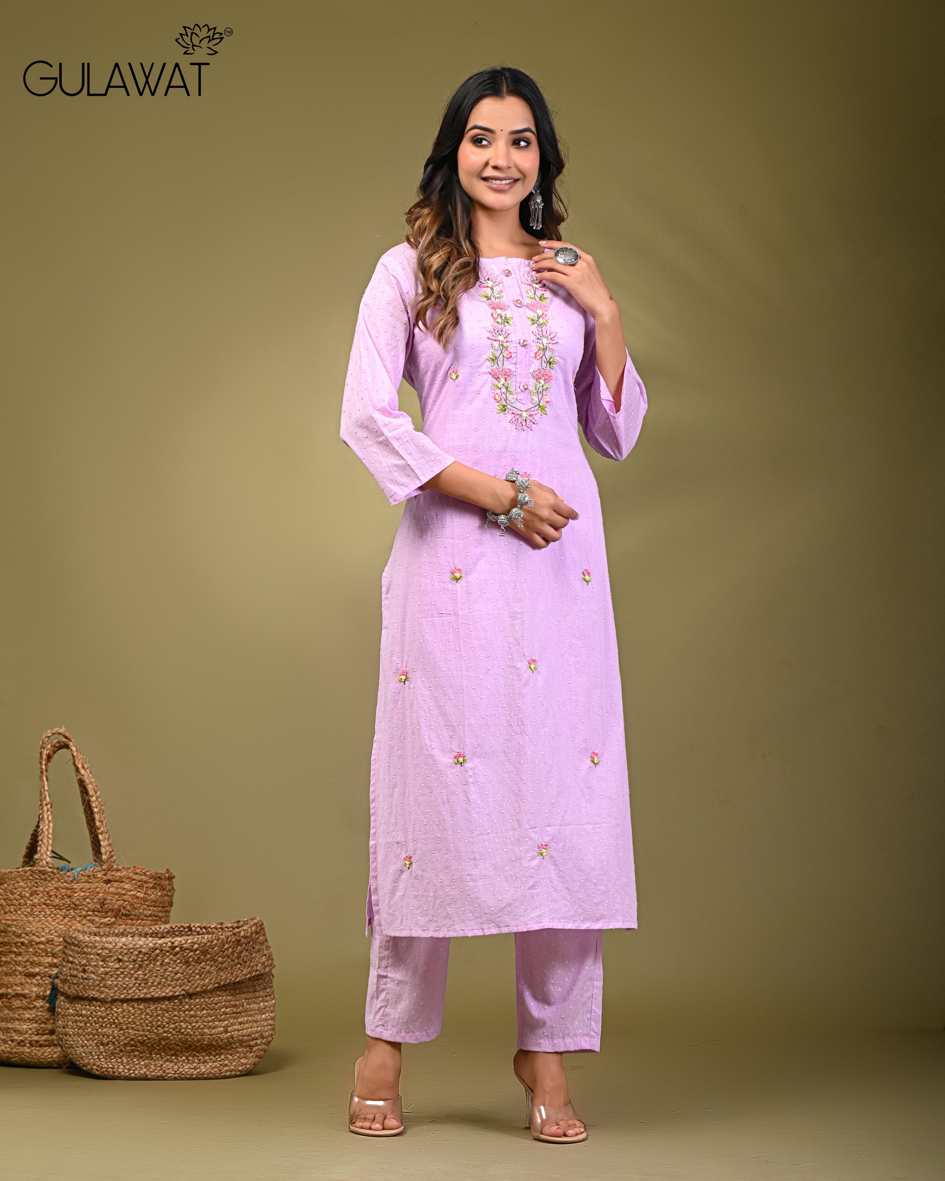 Elevate your style with this exquisite 2-piece set from Gulawat, featuring a beautifully embroidered. Crafted from 100% Pure Dobbie cotton, this set showcases intricate embroidery and thread work, blending the elegance of traditional.